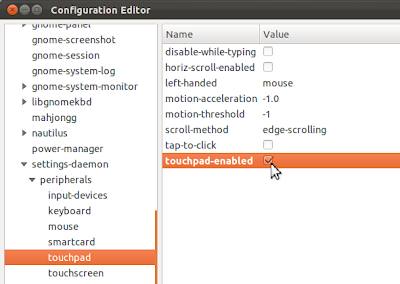 Have you upgraded to Ubuntu 11.10 Oneiric Ocelot, but your touchpad seems not working after this upgrade. The touchpad will work only at the login screen. If this is the case, then you may try to enable it using the Configuration Editor (dconf Editor).Open the terminal and install "dconf-tools" with this command: