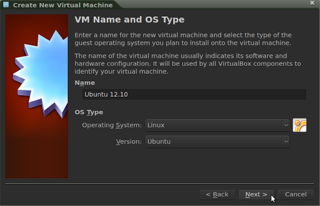 Open VirtualBox and click New, then in the VM setup wizard, click Next and enter a name for your VM (Ubuntu 12.10 for example):