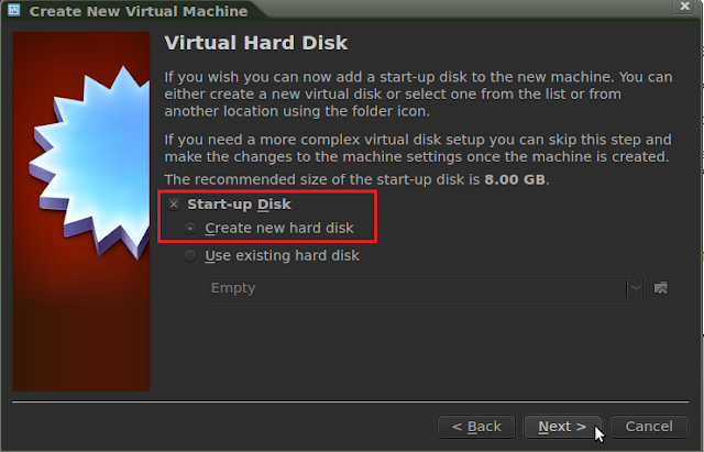 In the next screen, keep "Start-up Disk" and "Create new hard disk" options selected, then click Next: